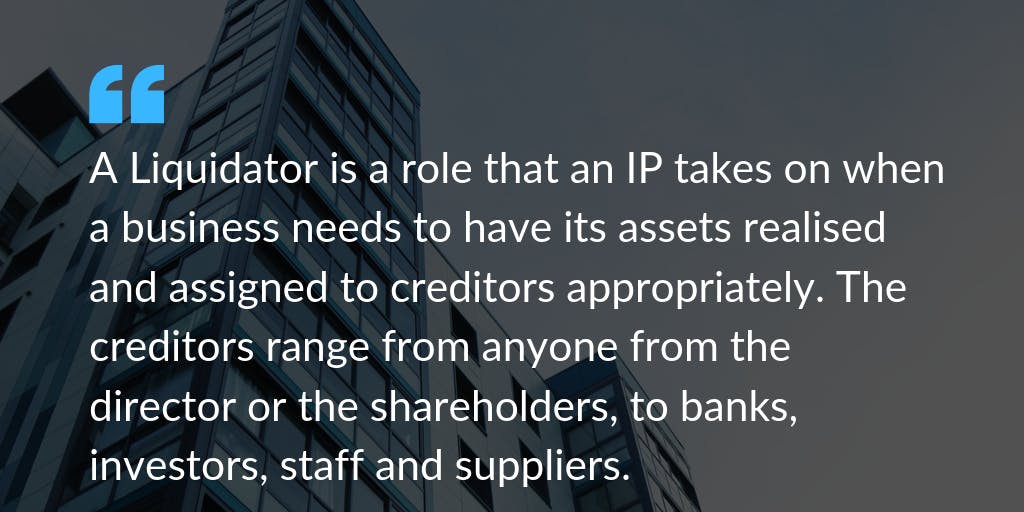 A Liquidator is a role that an IP takes on when a business needs to have its assets realised and assigned to creditors appropriately. The creditors range from anyone from the director or the shareholders, to banks, investors, staff and suppliers.