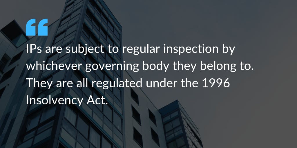 IPs are subject to regular inspection by whichever governing body they belong to. They are all regulated under the 1996 Insolvency Act.